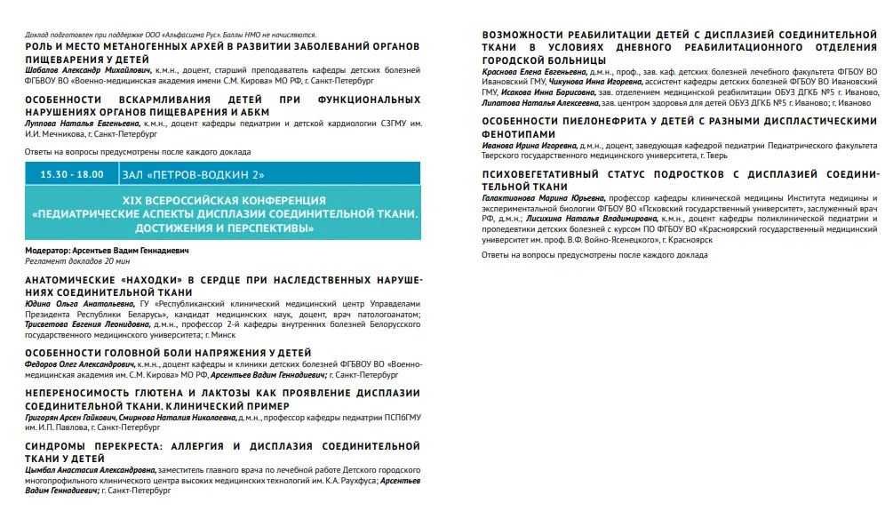 17 апреля 2026 г. в Санкт-Петербурге состоялся XX Всероссийский форум «ЗДОРОВЬЕ ДЕТЕЙ. СОВРЕМЕННАЯ СТРАТЕГИЯ ПРОФИЛАКТИКИ И ТЕРАПИИ ВЕДУЩИХ ЗАБОЛЕВАНИЙ. САНКТ-ПЕТЕРБУРГ – 2026» и XIX ВСЕРОССИЙСКАЯ КОНФЕРЕНЦИЯ с международным участием «ПЕДИАТРИЧЕСКИЕ АСПЕКТЫ ДИСПЛАЗИИ СОЕДИНИТЕЛЬНОЙ ТКАНИ. ДОСТИЖЕНИЯ И ПЕРСПЕКТИВЫ».
